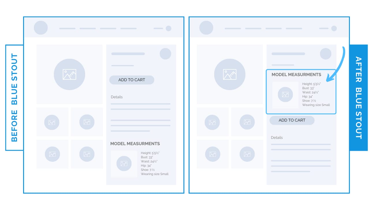 We added model measurements directly above “add to cart” in the buy box for a luxury clothing brand.